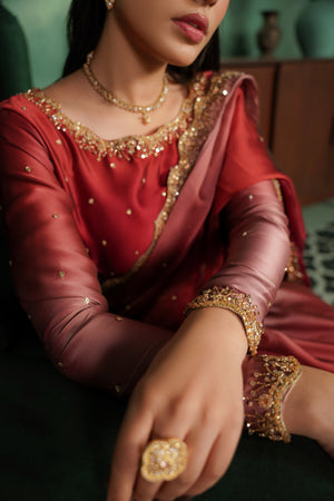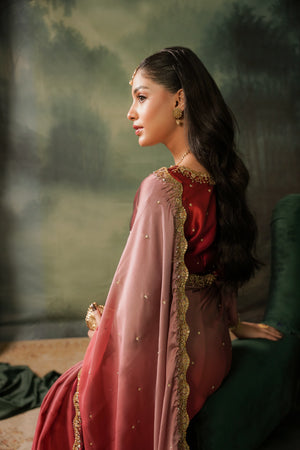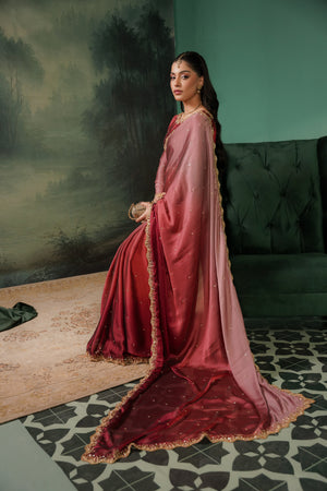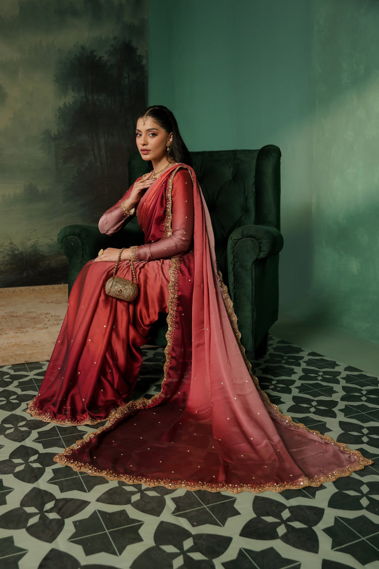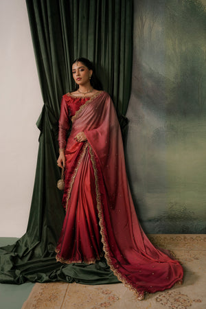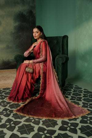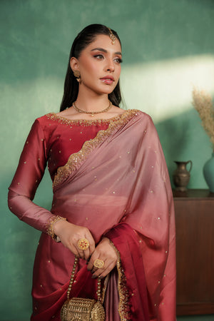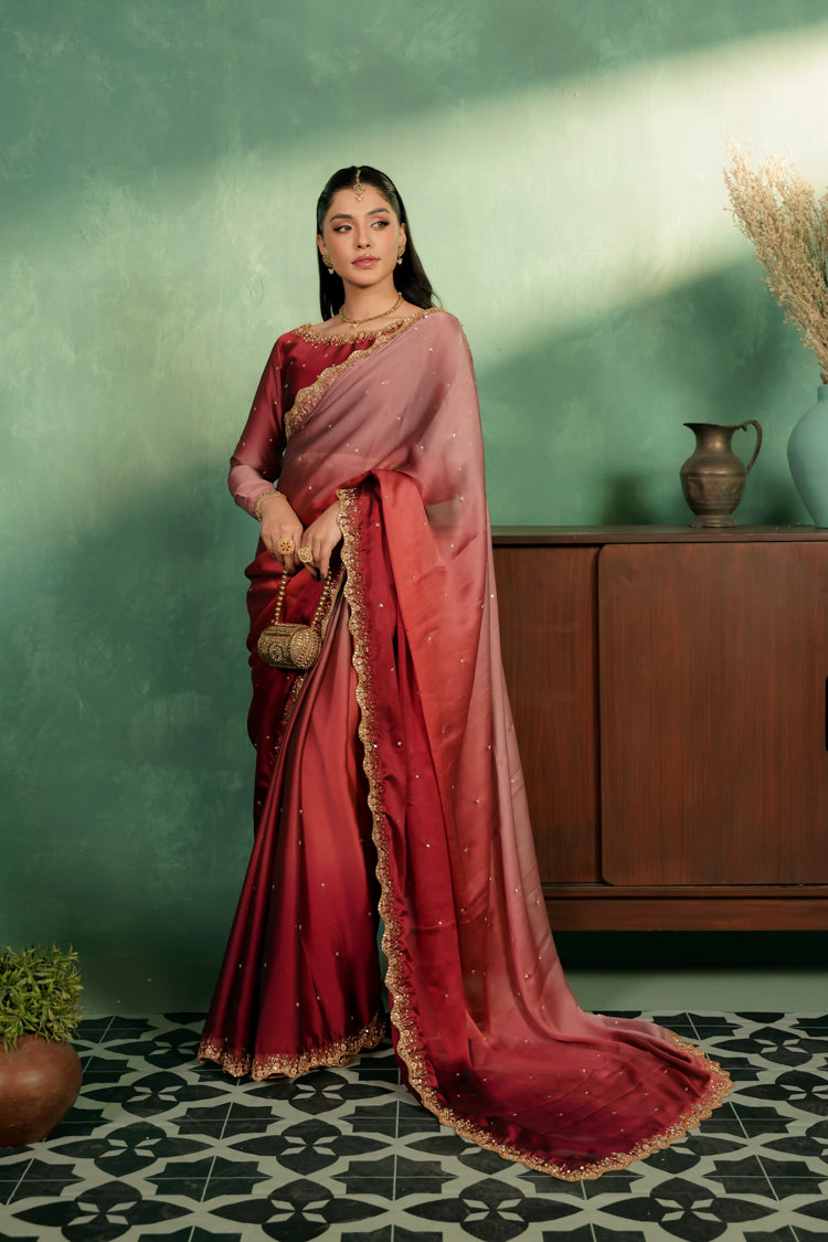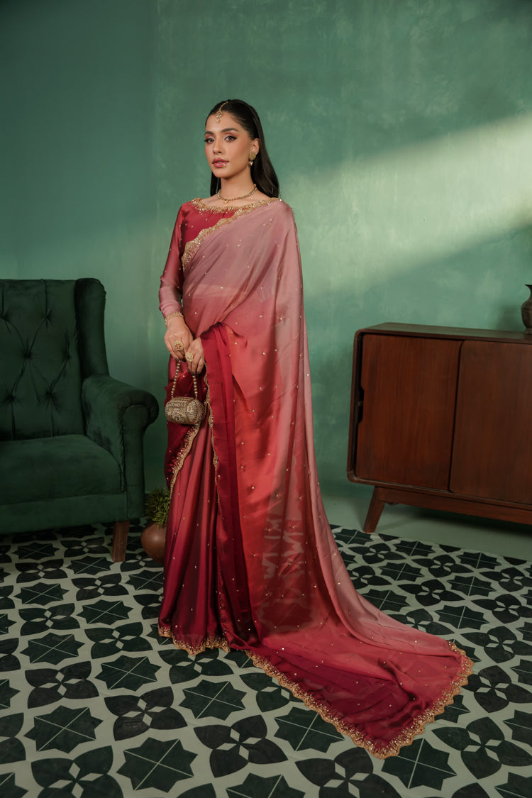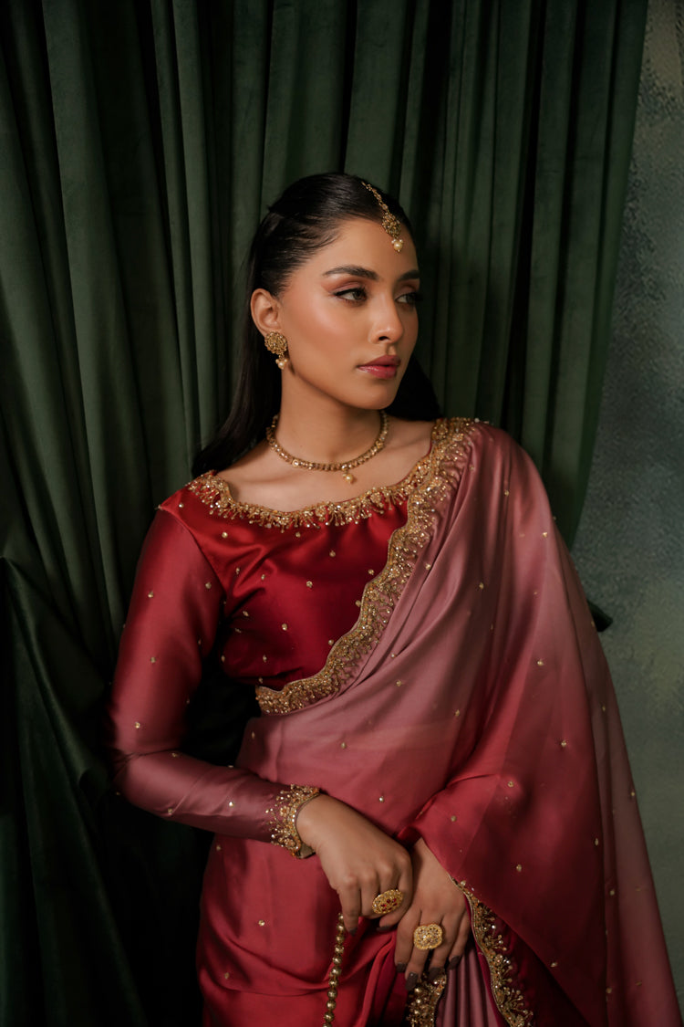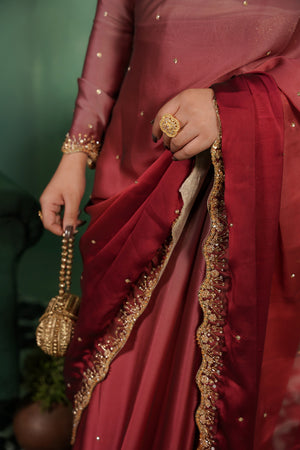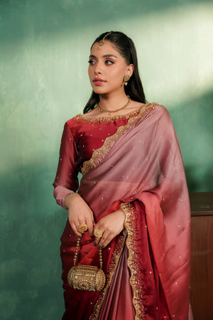 Elegant two-tone silk tissue sari with a soft ombré finish and intricate gold work, blending vibrant shocking pink with subtle tea pink and red accents. Finished with a delicate border and a lightly stone-embroidered blouse featuring a bordered neckline
