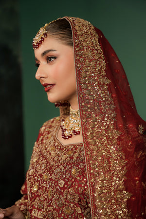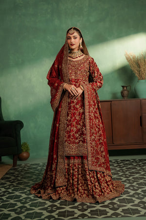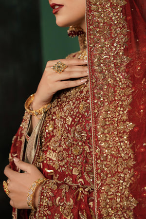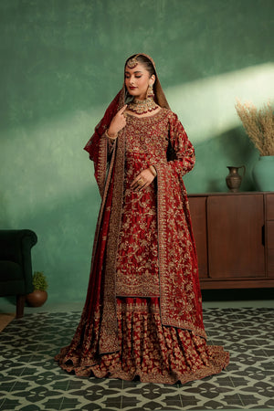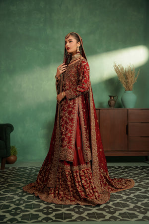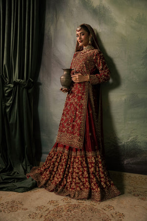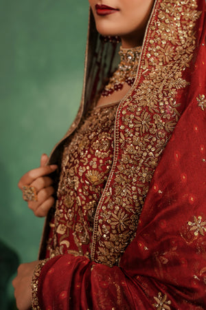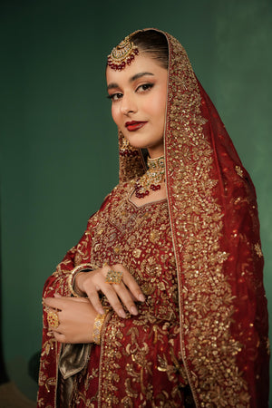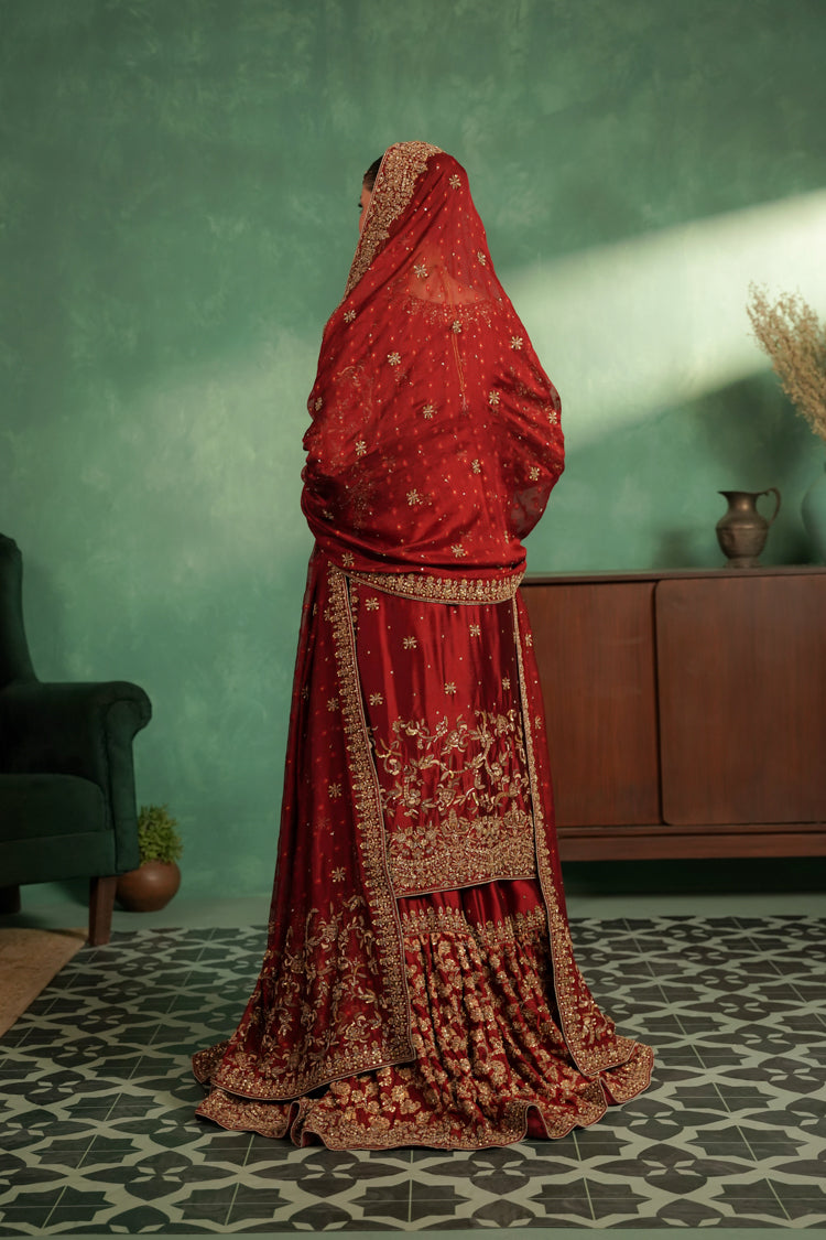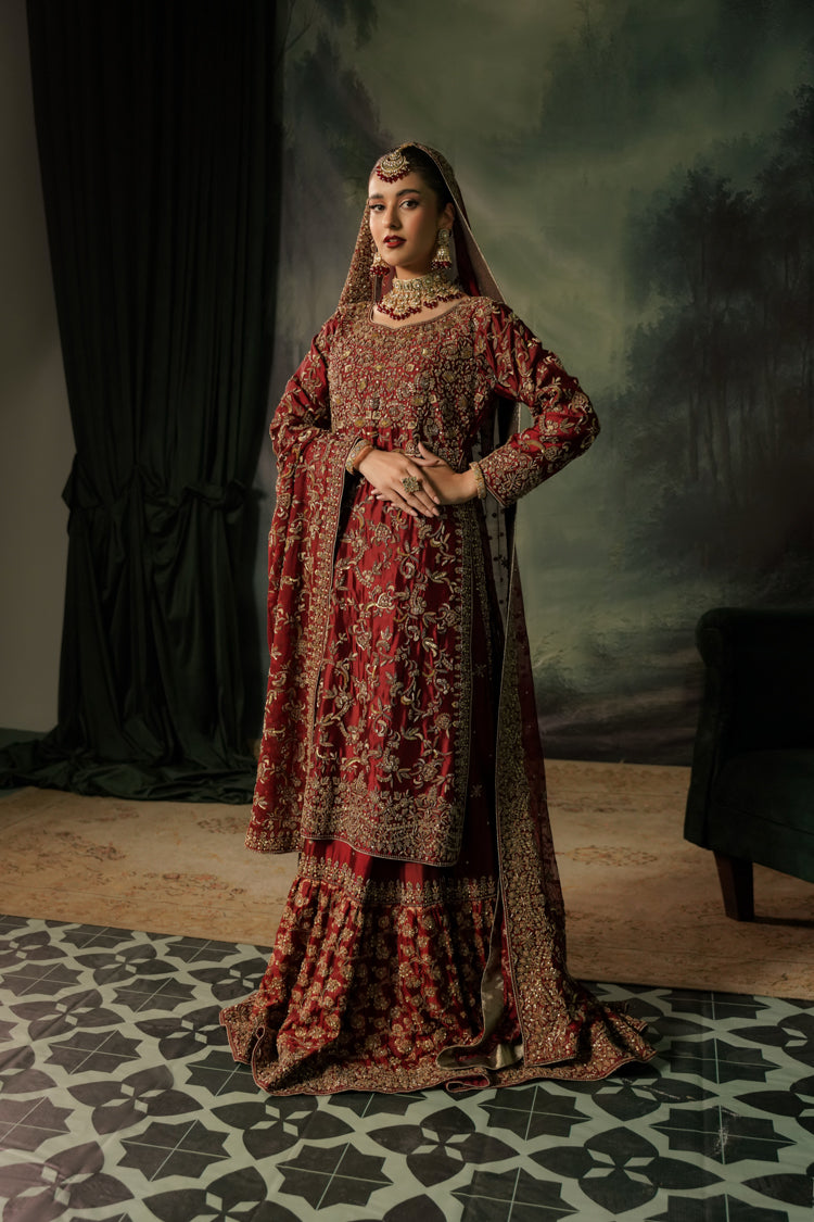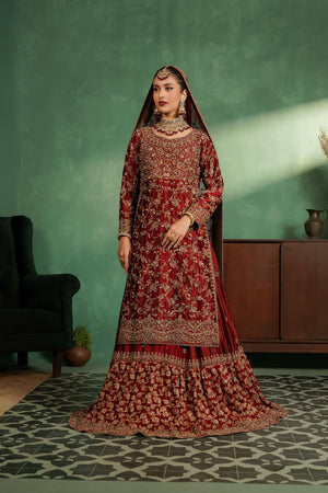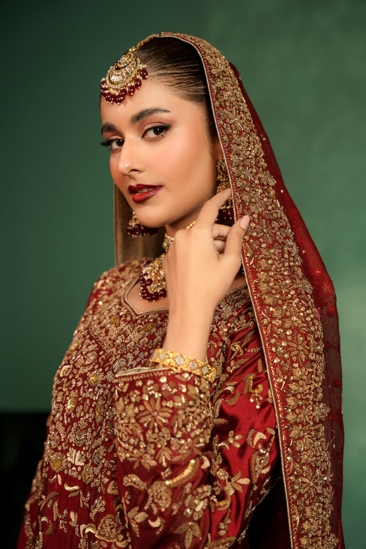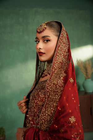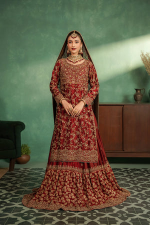 This luxurious deep red bridal ensemble features a heavily embellished long bodice paired with a grand farshi-style lehenga. The outfit is adorned with rich gold embroidery, intricate handwork, and a beautifully detailed neckline, giving it a regal and timeless appeal. The look is completed with a matching Khaadi net dupatta decorated with gold motifs and a heavily embellished border, creating a truly majestic bridal silhouette.